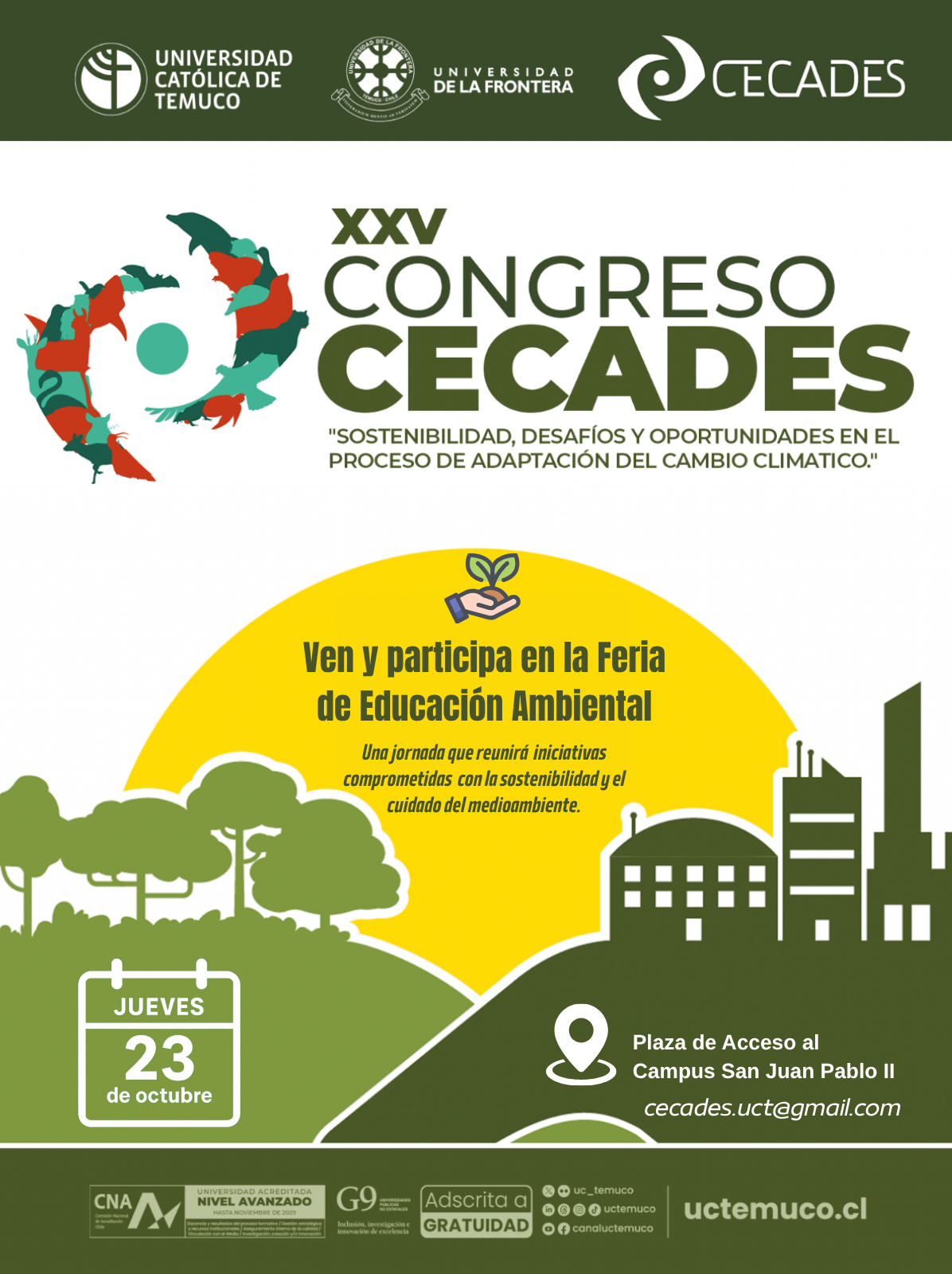 La Universidad Católica de Temuco será sede de la Feria de Educación Ambiental CECADES 2025, una jornada abierta a toda la comunidad universitaria y regional que se desarrollará el jueves 23 de octubre, en la Plaza de Acceso CJP07 del Campus San Juan Pablo II (entrada techada del edificio 08, contigua a la capilla).
