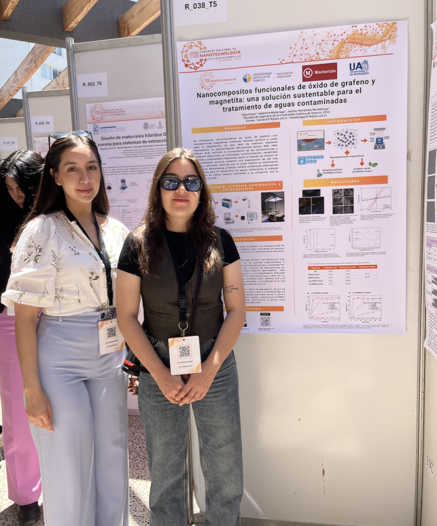 Durante la semana del 24 al 28 de noviembre de 2025, el equipo del Laboratorio de Biofísica y Biomateriales (LaBB) de la Facultad de Ingeniería de la UCT participó activamente en el VIII Congreso Nacional de Nanotecnología (CNN8), uno de los encuentros científicos más relevantes del país en esta área, realizado en la ciudad de La Serena (https://www.congresonano.cl/). El Dr. Jacobo Hernández Montelongo, responsable del LaBB, presentó la ponencia oral “Antibacterial and Molecular Dynamics Evaluation of Graphene Oxide–Peptide Coatings on Urinary Catheters”; en ese sentido, la técnico de investigación Tanya Plaza presentó el póster “Funcionalización de catéteres urinarios con óxido de grafeno y péptidos antimicrobianos para la prevención de CAUTIs”. Asimismo, las egresadas de la Facultad de Ingeniería y ex-tesistas del LaBB, Valentina Madariaga y Olga Durán, presentaron el póster “Nanocompuestos funcionales de óxido de grafeno y magnetita: una solución sustentable para el tratamiento de aguas contaminadas”, investigación desarrollada durante sus trabajos de titulación y orientada a aportar alternativas económicas y ecológicas a los procesos de descontaminación. El CNN8 continúa consolidándose como el principal espacio de encuentro de la comunidad nanotecnológica chilena. Año a año, congrega a investigadores, estudiantes y profesionales que buscan compartir resultados, recibir retroalimentación especializada, conocer las tendencias emergentes del campo y establecer nuevas redes de colaboración que potencian el desarrollo científico nacional. La participación del LaBB en esta versión del congreso se enmarca en las actividades del proyecto Fondecyt Regular N.º 1230553, lo que refleja el compromiso del laboratorio con la investigación de frontera y la formación de nuevas generaciones de especialistas. ¡Felicitaciones al Laboratorio de Biofísica y Biomateriales por su activa, diversa y exitosa presencia en uno de los eventos más importantes de la nanotecnología en Chile!