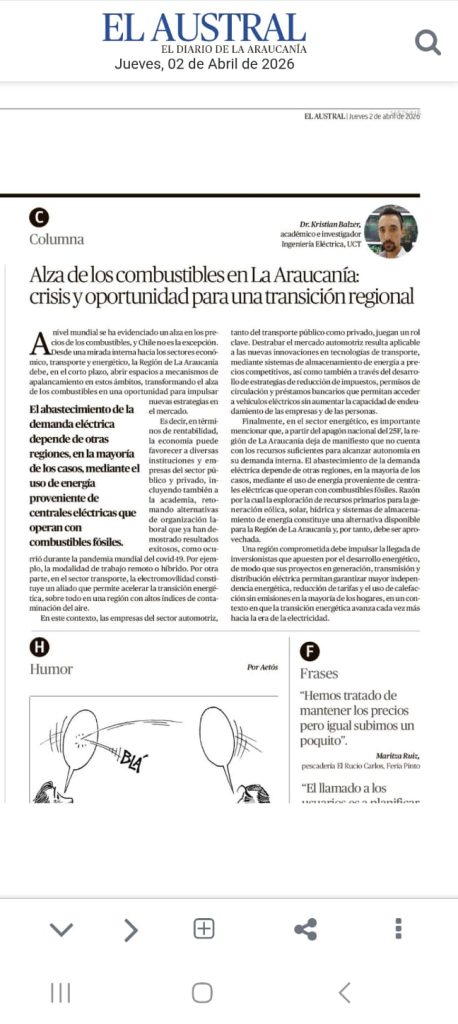 El académico e investigador de la carrera de Ingeniería Eléctrica de la Facultad de Ingeniería de la Universidad Católica de Temuco, Dr. Kristian Balzer, publicó recientemente una columna de opinión en el Diario Austral de La Araucanía, titulada “Alza de los combustibles en La Araucanía: crisis y oportunidad para una transición regional”.