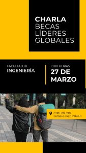 La Facultad de Ingeniería invita a sus estudiantes a participar en la charla informativa sobre la Beca Líderes Globales, una instancia que se desarrollará hoy viernes 27 de marzo, a las 15:00 horas, en la Sala CJP_08_390, en conjunto con la Dirección de Relaciones Internacionales.