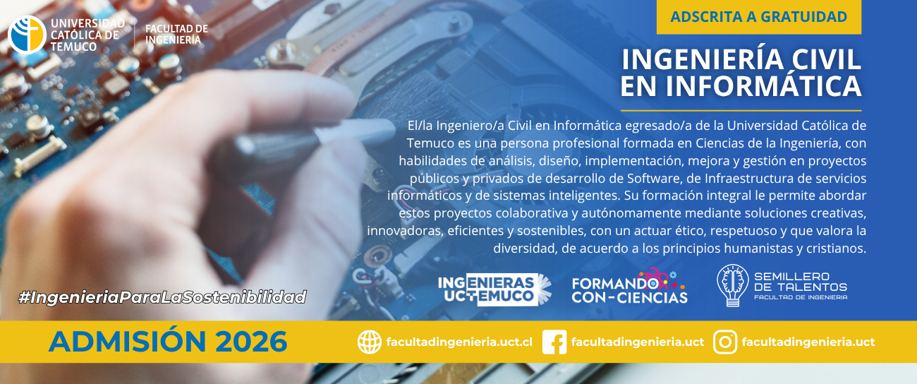 El/la Ingeniero/a Civil en Informática egresado/a de la Universidad Católica de Temuco es una persona profesional formada en Ciencias de la Ingeniería, con habilidades de análisis, diseño, implementación, mejora y gestión en proyectos públicos y privados de desarrollo de Software, de Infraestructura de servicios informáticos y de sistemas inteligentes. Su formación integral le permite abordar estos proyectos colaborativa y autónomamente mediante soluciones creativas, innovadoras, eficientes y sostenibles, con un actuar ético, respetuoso y que valora la diversidad, de acuerdo a los principios humanistas y cristianos.