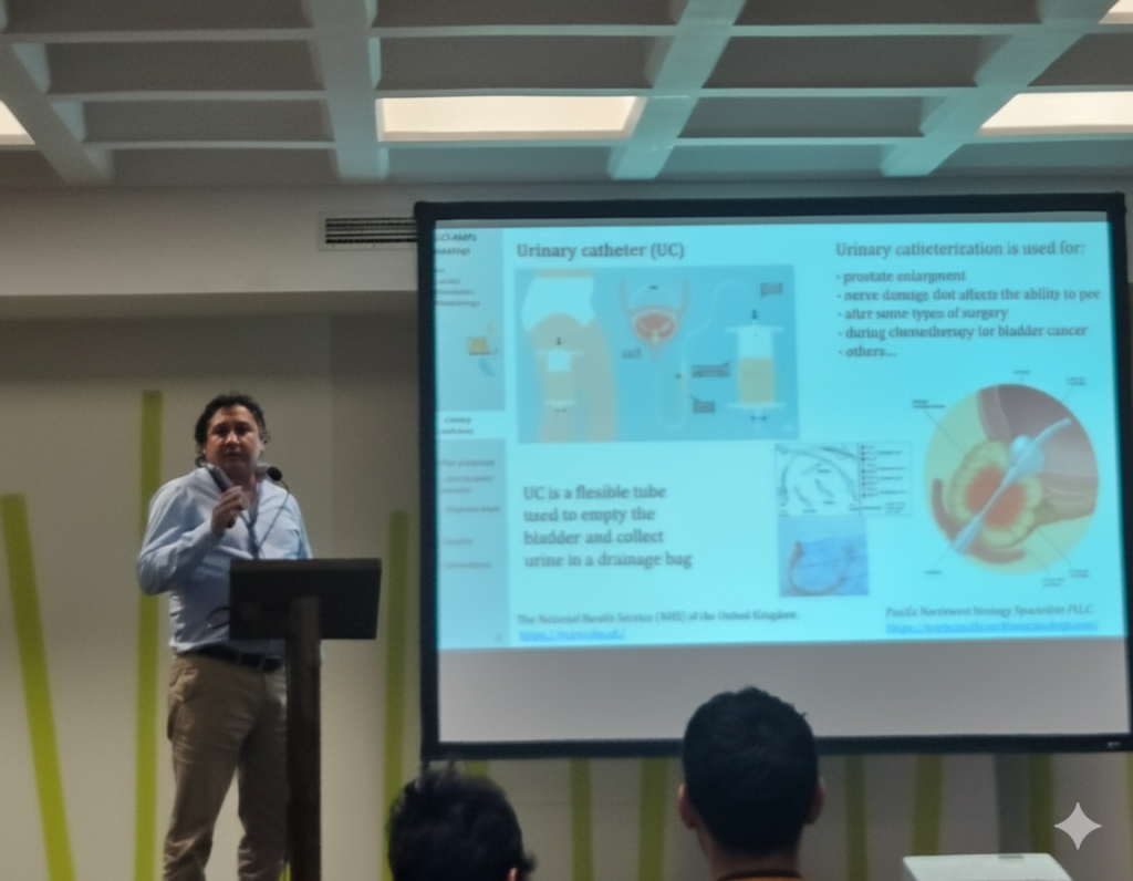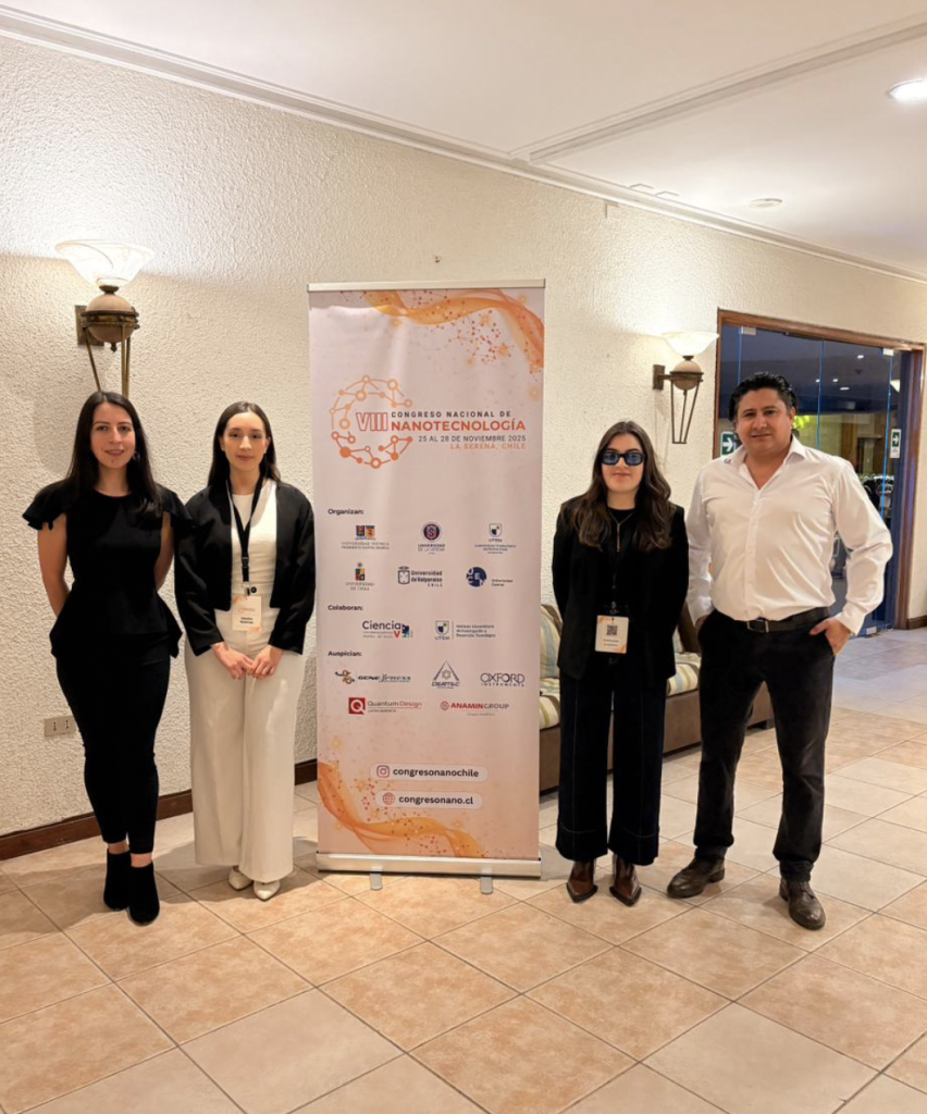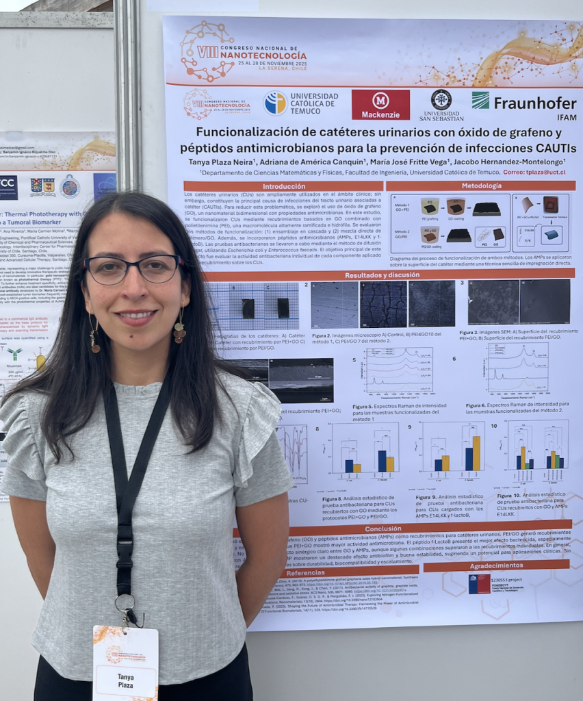 Durante la semana del 24 al 28 de noviembre de 2025, el equipo del Laboratorio de Biofísica y Biomateriales (LaBB) de la Facultad de Ingeniería de la UCT participó activamente en el VIII Congreso Nacional de Nanotecnología (CNN8), uno de los encuentros científicos más relevantes del país en esta área, realizado en la ciudad de La Serena (https://www.congresonano.cl/). El Dr. Jacobo Hernández Montelongo, responsable del LaBB, presentó la ponencia oral “Antibacterial and Molecular Dynamics Evaluation of Graphene Oxide–Peptide Coatings on Urinary Catheters”; en ese sentido, la técnico de investigación Tanya Plaza presentó el póster “Funcionalización de catéteres urinarios con óxido de grafeno y péptidos antimicrobianos para la prevención de CAUTIs”. Asimismo, las egresadas de la Facultad de Ingeniería y ex-tesistas del LaBB, Valentina Madariaga y Olga Durán, presentaron el póster “Nanocompuestos funcionales de óxido de grafeno y magnetita: una solución sustentable para el tratamiento de aguas contaminadas”, investigación desarrollada durante sus trabajos de titulación y orientada a aportar alternativas económicas y ecológicas a los procesos de descontaminación. El CNN8 continúa consolidándose como el principal espacio de encuentro de la comunidad nanotecnológica chilena. Año a año, congrega a investigadores, estudiantes y profesionales que buscan compartir resultados, recibir retroalimentación especializada, conocer las tendencias emergentes del campo y establecer nuevas redes de colaboración que potencian el desarrollo científico nacional. La participación del LaBB en esta versión del congreso se enmarca en las actividades del proyecto Fondecyt Regular N.º 1230553, lo que refleja el compromiso del laboratorio con la investigación de frontera y la formación de nuevas generaciones de especialistas. ¡Felicitaciones al Laboratorio de Biofísica y Biomateriales por su activa, diversa y exitosa presencia en uno de los eventos más importantes de la nanotecnología en Chile!